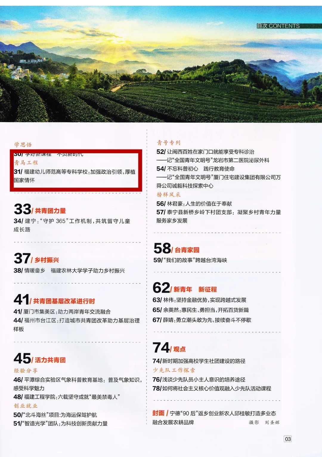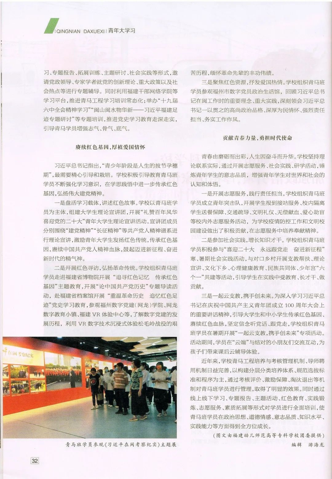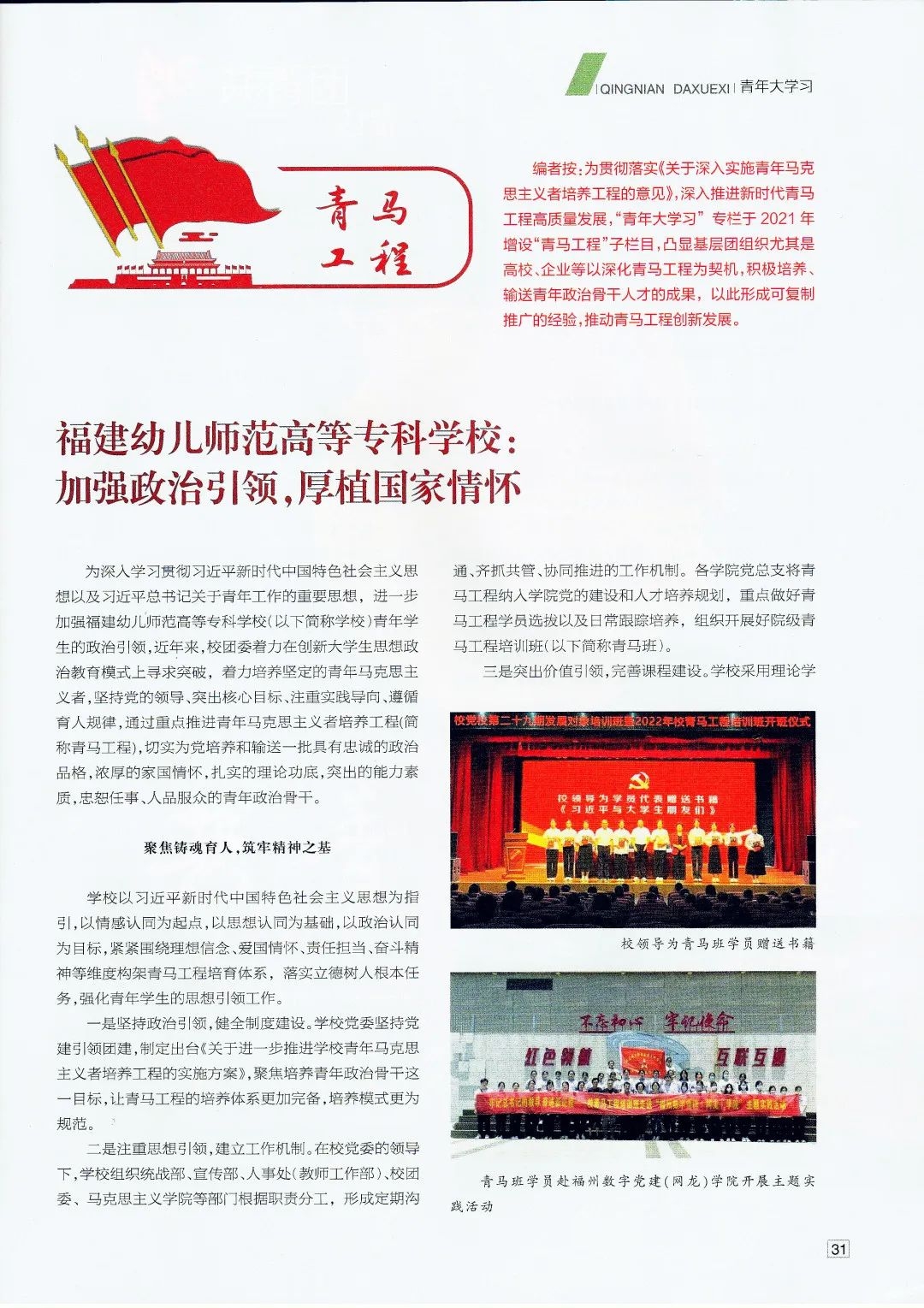 近日,由共青團(tuán)福建省委主辦的《福建青年》雜志以《福建幼兒師范高等專科學(xué)校:加強(qiáng)政治引領(lǐng),厚植家國情懷》為題,專欄宣傳報(bào)道我校青馬工程典型經(jīng)驗(yàn)做法。