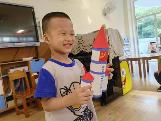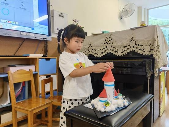 通過觀看視頻、參觀科技館、談話等活動,萌娃們了解了助推器、整流罩、逃逸塔等火箭構(gòu)造,他們也成為小小設(shè)計師,用紙盒、礦泉水瓶、紙杯等制造了"最強火箭",實現(xiàn)自己的"飛天夢"。
