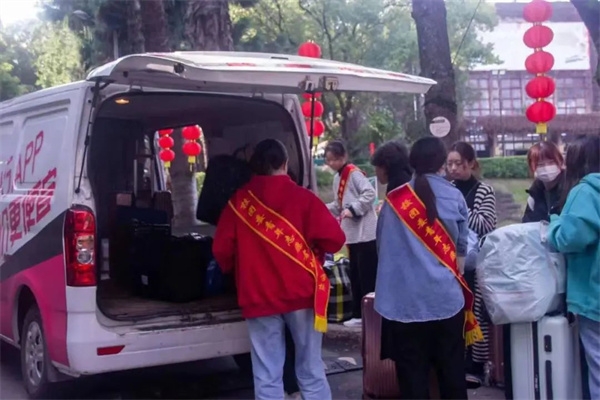 圖為志愿者為返校學(xué)子搬運(yùn)行李