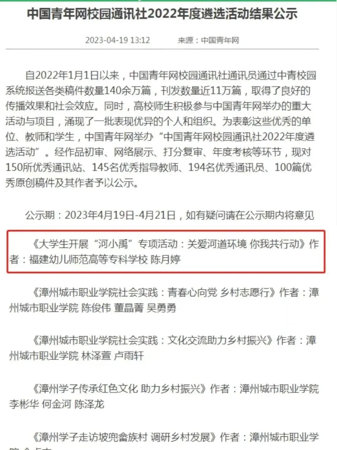 去年以來,我校入選中青網(wǎng)宣傳稿件十余篇,獲評(píng)一個(gè)優(yōu)秀攝影團(tuán)隊(duì),入選一篇優(yōu)秀稿件,學(xué)校成功獲批建立中青網(wǎng)校園通訊站。