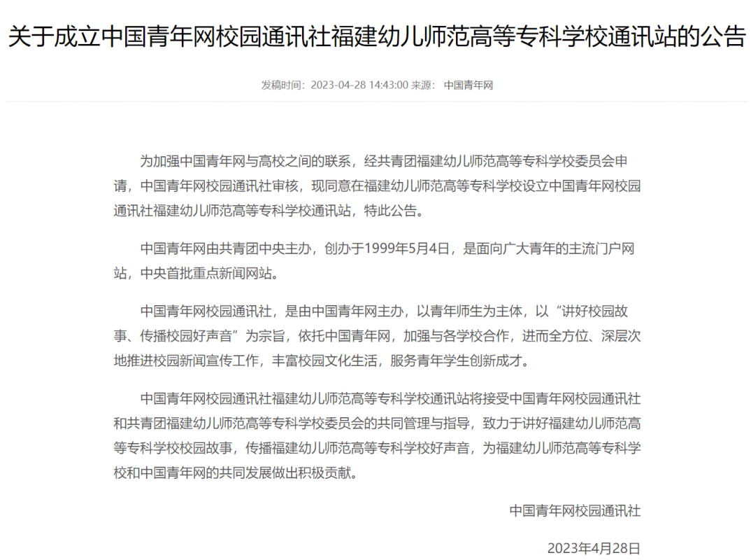 日前,中國(guó)青年網(wǎng)發(fā)布公告,正式成立中國(guó)青年網(wǎng)校園通訊社福建幼兒師范高等??茖W(xué)校通訊站。