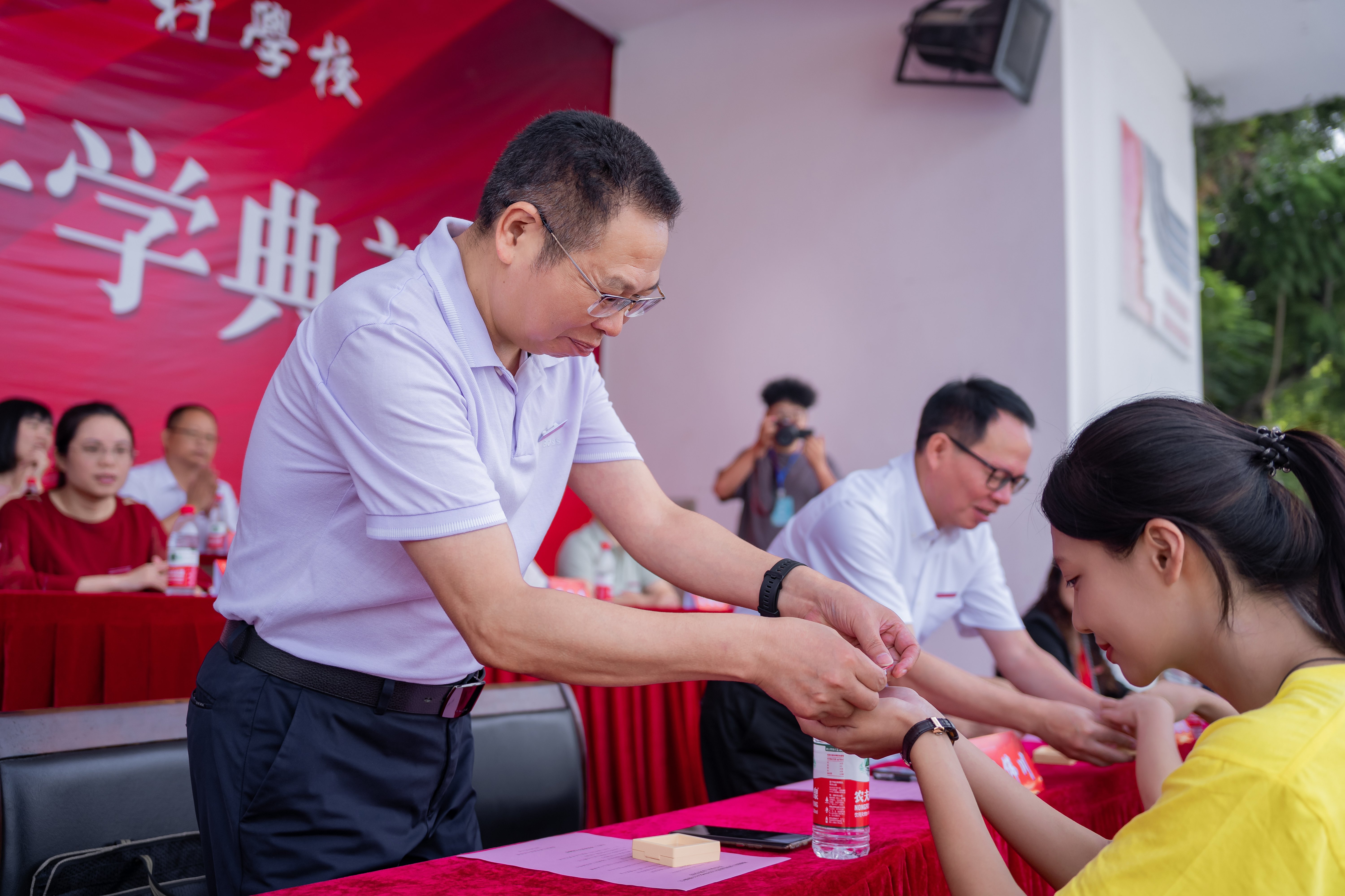 (圖為校黨委書(shū)記鮑仕梅,校長(zhǎng)林偉川為新生代表佩戴?;眨?/p>