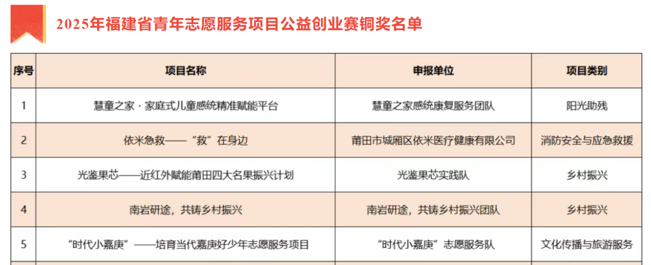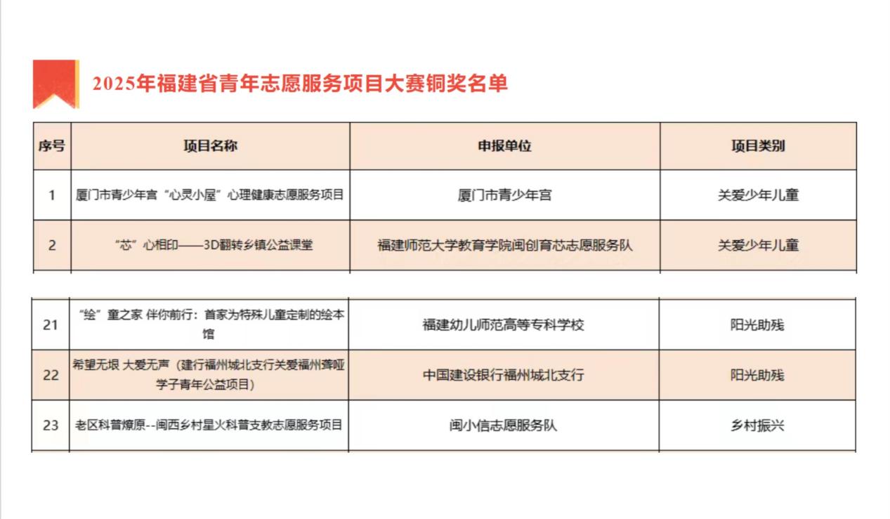 熱烈祝賀!近日在2025年福建省青年志愿服務(wù)項目大賽和福建省青年志愿服務(wù)公益創(chuàng)業(yè)賽中,我校兩個志愿服務(wù)項目在全省眾多優(yōu)秀項目中脫穎而出,雙雙榮獲省級銅獎!充分彰顯了我校青年志愿服務(wù)的卓越成效和公益創(chuàng)業(yè)的蓬勃活力!