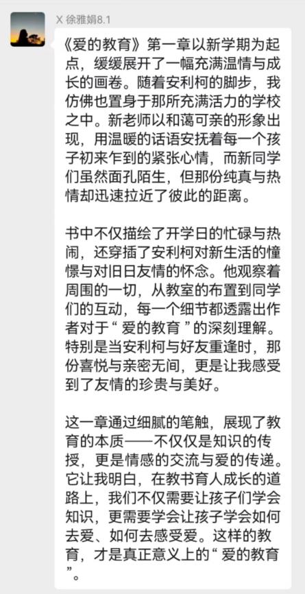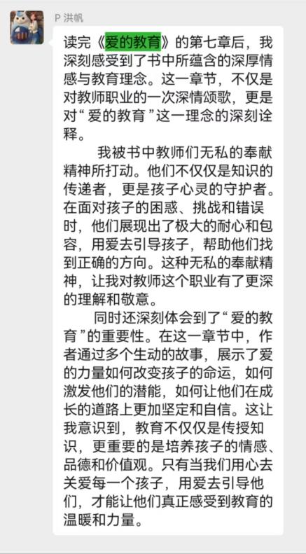 團(tuán)員老師們再次重溫我校教育家黃世明先生愛的教育與提倡的兒童科學(xué)化之精神,與我園彩虹課程教育理念進(jìn)行鏈接與融合,結(jié)合假期的好書共讀活動,共同閱讀世界名著《愛的教育》,從一個個樸素的故事中去感受愛、看見愛。工作期間老師們也不斷踐行、傳承、弘揚(yáng)教育家精神。用愛心、耐心、責(zé)任心陪伴孩子們健康快樂成長。