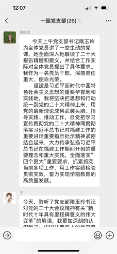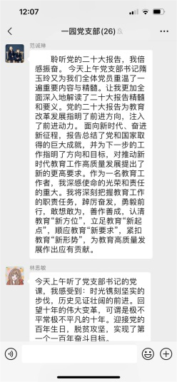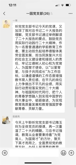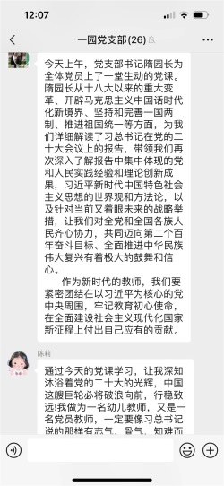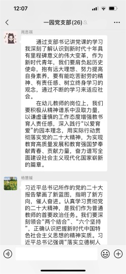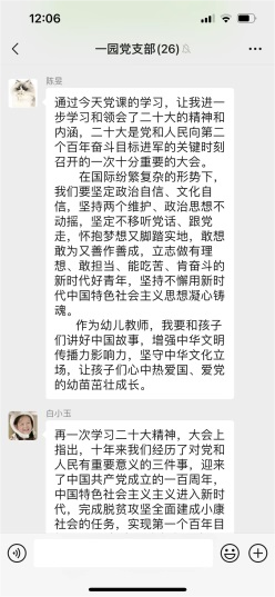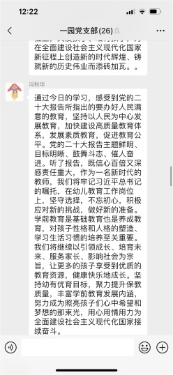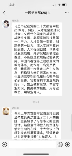 全體黨員在收看二十大開幕會盛況直播、閱讀習(xí)近平總書記報告全文、瀏覽各大新聞媒體相關(guān)報道之后,通過聆聽支部書記以黨課的方式對二十大報告進(jìn)行深刻而明晰的解讀,內(nèi)心更加歡欣鼓舞,紛紛通過黨支部微信群進(jìn)行線上學(xué)習(xí)心得的交流與互動。每位黨員都立足自己的生活、學(xué)習(xí)和工作,真誠地表達(dá)對黨的二十大召開的真情實感,以及對近平總書記工作報告的心得體會。大家一致認(rèn)為習(xí)近平總書記所作的報告內(nèi)涵豐富、思想深邃,對過去五年工作和新時代十年偉大成就的總結(jié)令人鼓舞、催人奮進(jìn),更加堅定了自己的初心和使命:立足崗位創(chuàng)新實踐,努力辦好人民滿意的學(xué)前教育,為培養(yǎng)德智體美勞全面發(fā)展的社會主義事業(yè)建設(shè)者和接班人,為構(gòu)建高質(zhì)量的學(xué)前教育體系而踔厲奮斗。