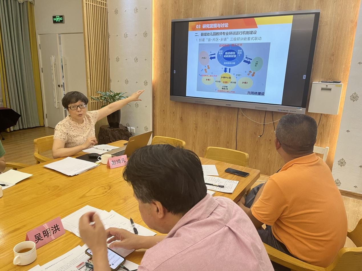 課題主持人彭琦凡教授從研究問題、研究程序、研究發(fā)現(xiàn)與討論、研究成果與推廣、反思與建議等方面向?qū)<疫M(jìn)行了詳細(xì)匯報(bào)。經(jīng)過聽取匯報(bào)、審議材料、問答評(píng)議等環(huán)節(jié),評(píng)審專家認(rèn)為該課題選題凸顯了當(dāng)前教育發(fā)展對(duì)"教育公平""高質(zhì)量發(fā)展與區(qū)域整體均衡""鄉(xiāng)村振興"等問題的關(guān)注,具有前瞻性和政策導(dǎo)向,理論研究和實(shí)踐研究緊密結(jié)合,研究思路體現(xiàn)了整體性與創(chuàng)新性,解決了農(nóng)村幼兒教師研訓(xùn)資源少的問題,激活了干預(yù)機(jī)制,催生了當(dāng)?shù)亟處煹闹黧w性學(xué)習(xí)文化。課題在三年疫情的背景下,依舊取得了論文、模型、培訓(xùn)、規(guī)模推廣等形式多樣的成果,產(chǎn)生了真實(shí)的實(shí)際效益和較大的影響力。會(huì)上,評(píng)審專家還從項(xiàng)目研究成果的推廣應(yīng)用等方面提出了改進(jìn)意見和建議。彭琦凡教授工作室組織團(tuán)隊(duì)成員參與課題結(jié)題材料的準(zhǔn)備與評(píng)審活動(dòng)的學(xué)習(xí)。