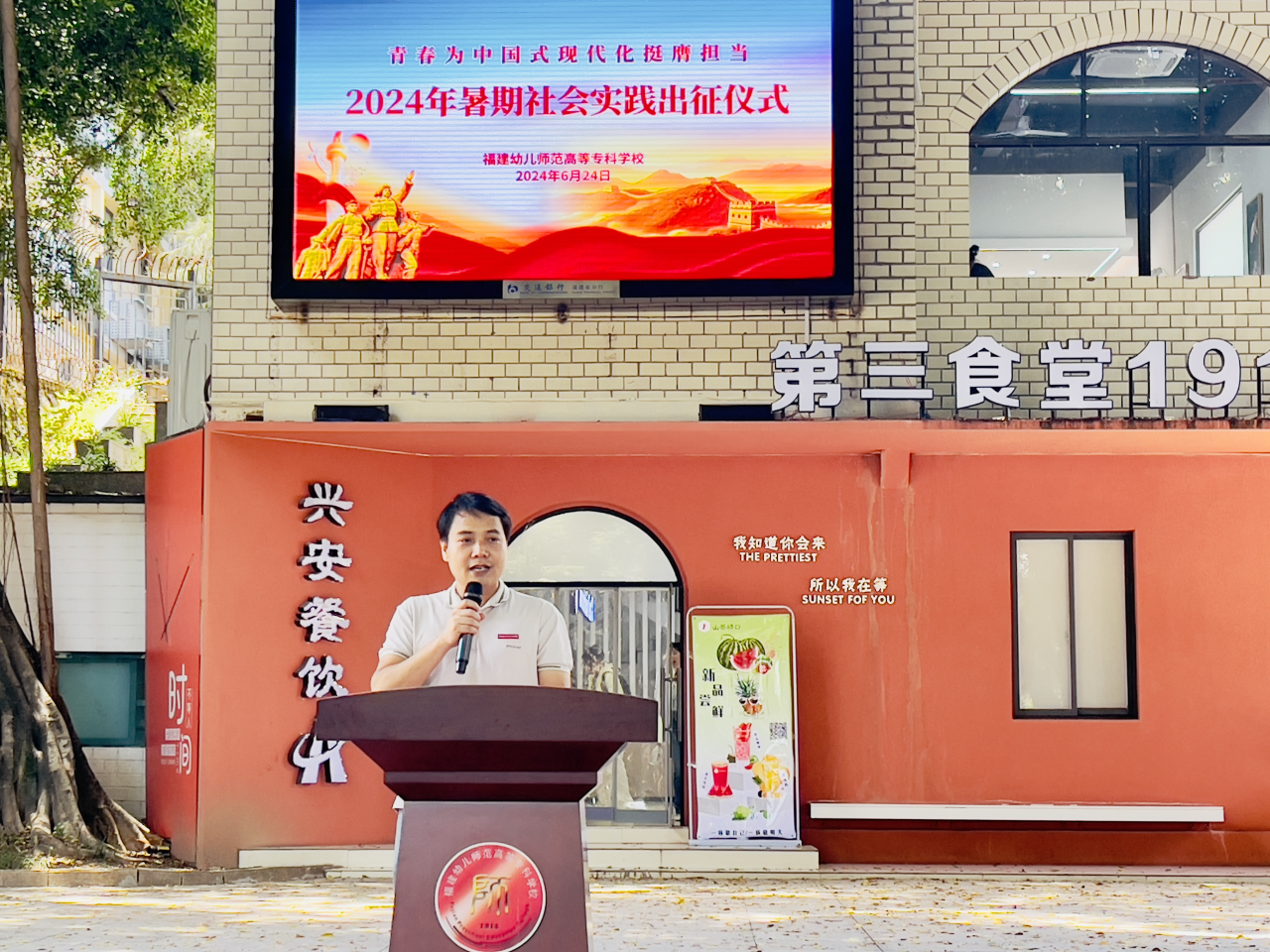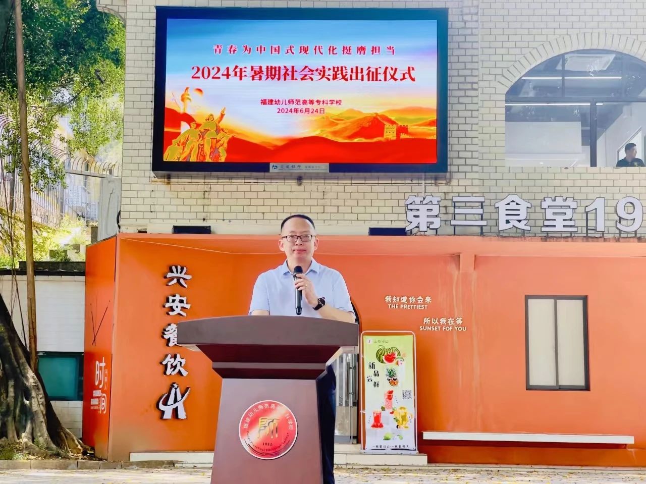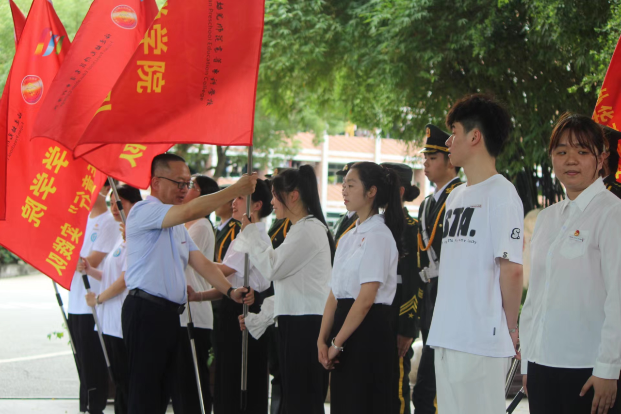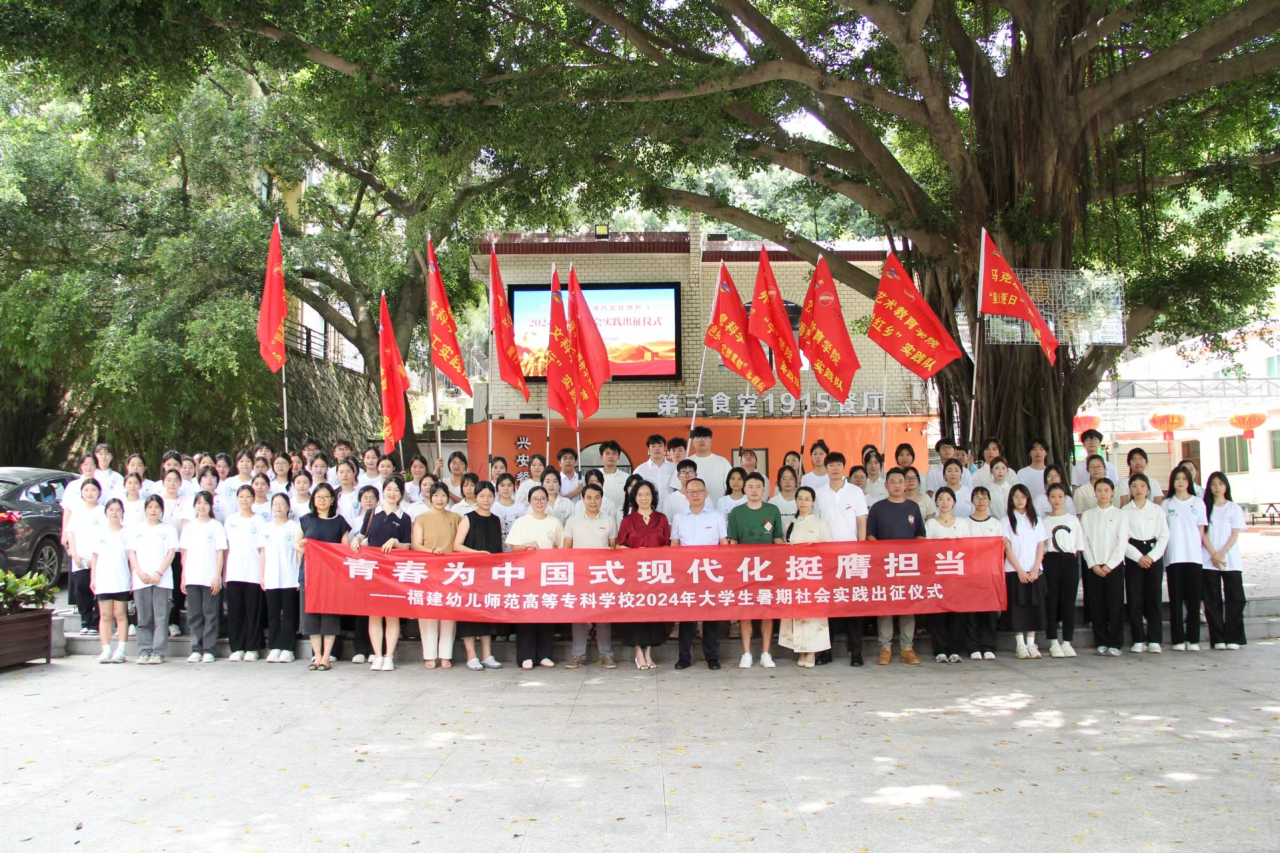 6月24日中午,福建幼兒師范高等??茖W(xué)校2024年大學(xué)生暑期社會實(shí)踐出征儀式在倉山校區(qū)榕樹廣場隆重舉行。校黨委副書記鄒雄偉出席活動并致辭。校關(guān)工委副主任鄭健成、校團(tuán)委全體工作人員、各學(xué)院分團(tuán)委書記、帶隊(duì)教師代表、實(shí)踐隊(duì)員代表出席參加活動。此次儀式由校團(tuán)委書記胡華榮主持。