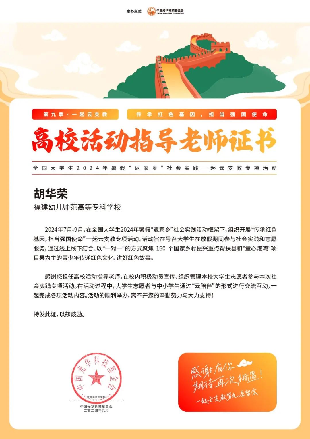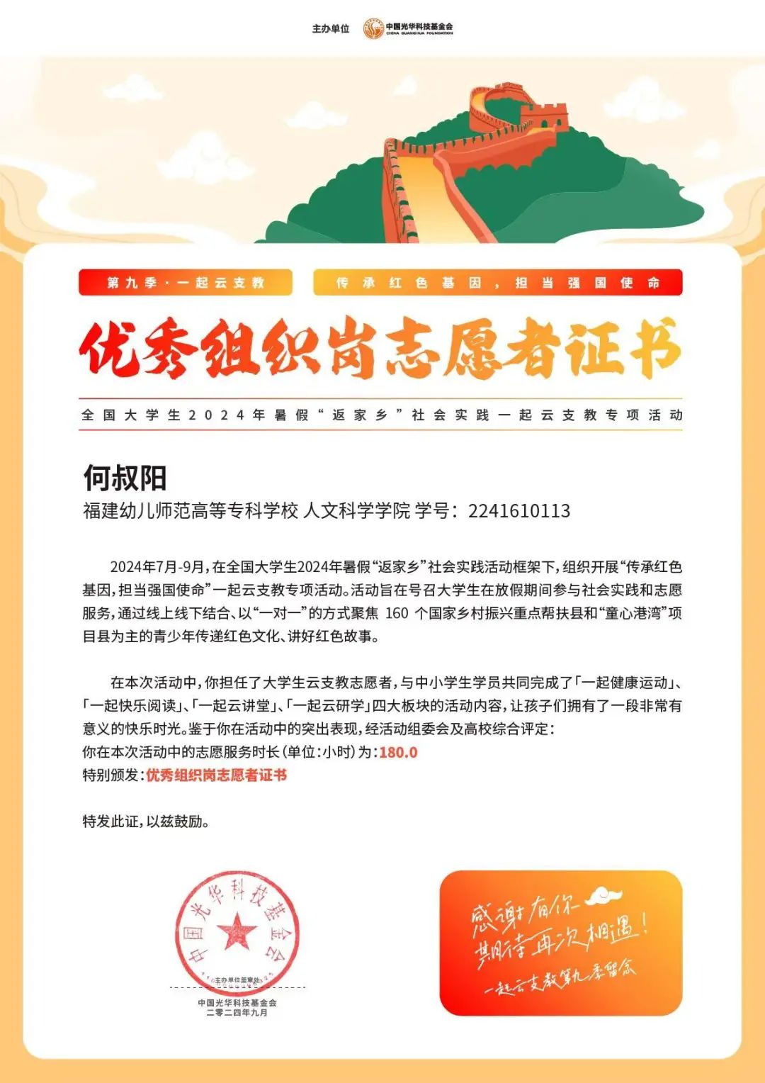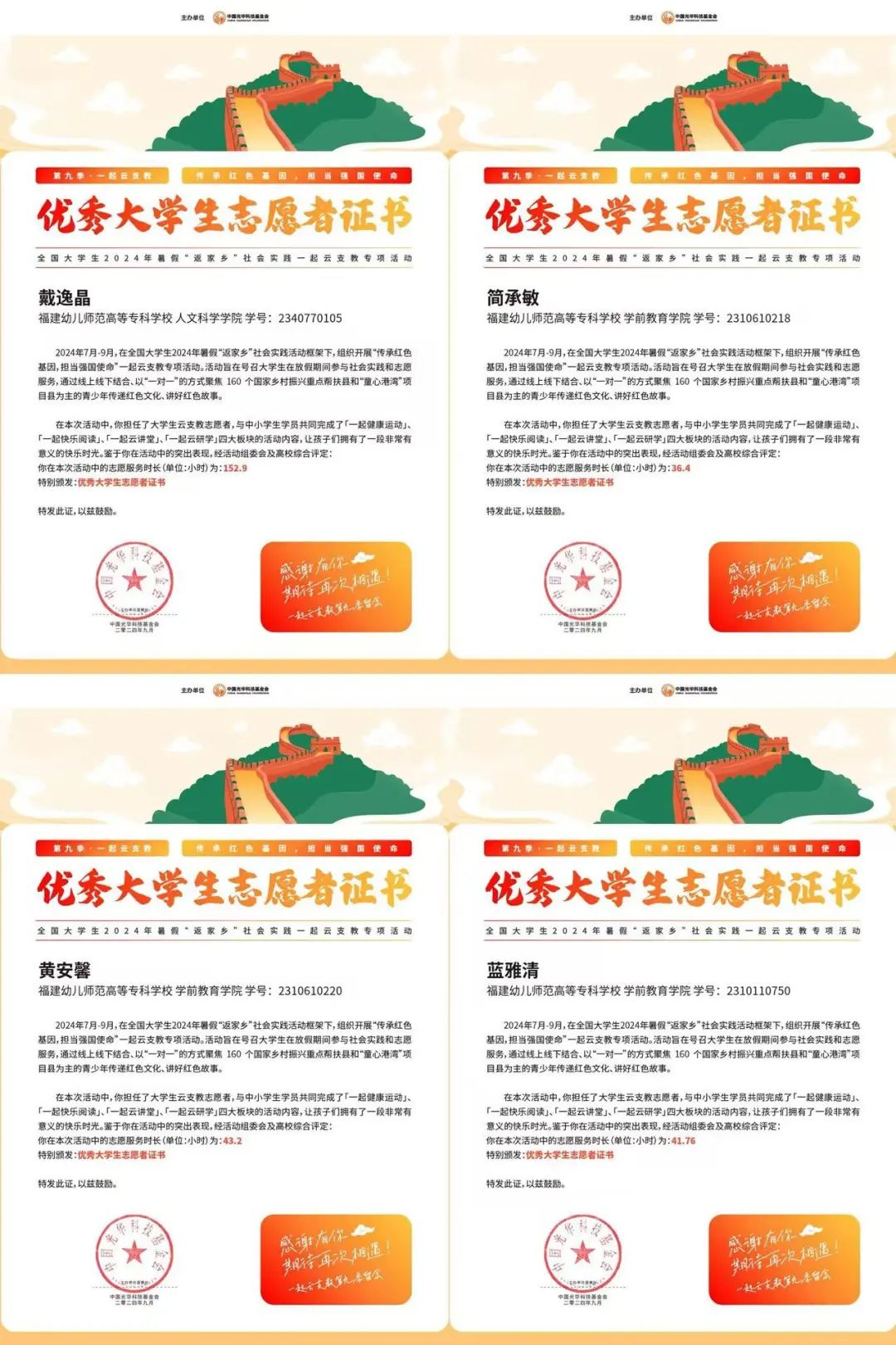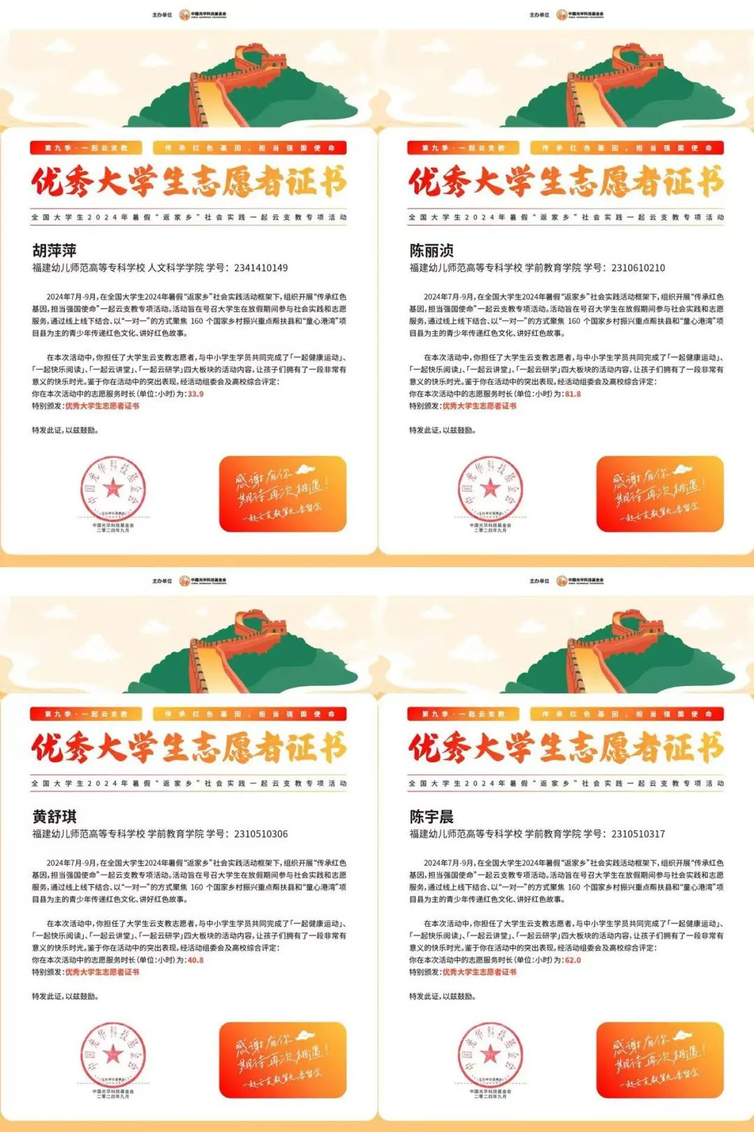 2024年7月至8月期間,我校開展為期一個(gè)月的“傳承紅色基因,擔(dān)當(dāng)強(qiáng)國使命”暑期“返家鄉(xiāng)”社會實(shí)踐專項(xiàng)活動(dòng)?;顒?dòng)內(nèi)容涵蓋【一起快樂閱讀】、【一起健康運(yùn)動(dòng)】、【一起云課堂】、【一起云研學(xué)】4個(gè)板塊。我校團(tuán)委書記胡華榮擔(dān)任指導(dǎo)老師,實(shí)踐團(tuán)隊(duì)111名志愿者通過線上及線下“云支教”的方式對接了160名中小學(xué)生。我校還與三明市尤溪縣西城中心小學(xué)合作,對口招募了近200個(gè)小學(xué)生。線上與線下累計(jì)志愿服務(wù)時(shí)長2770多小時(shí)。