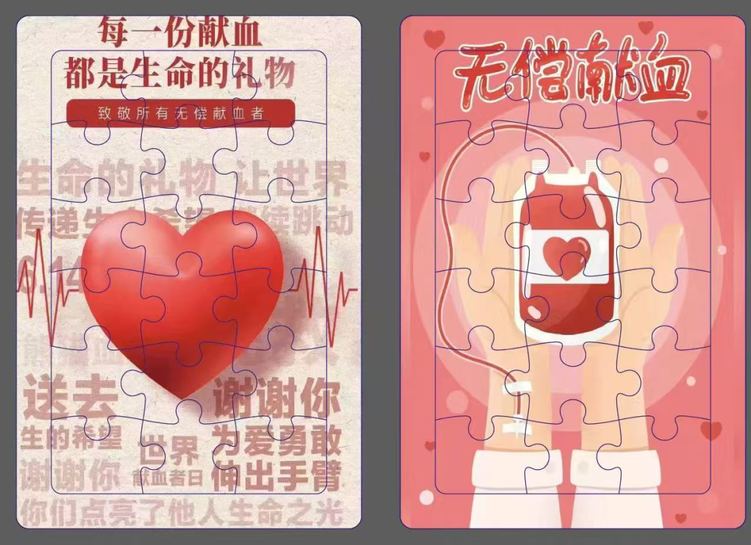 每一片拼圖,都是生命的熱血篇章,參與獻(xiàn)血后,同學(xué)們可以任意選擇一副拼圖,將其拼繪完整,完成此活動(dòng)可獲得獎(jiǎng)?wù)乱幻丁?/span>