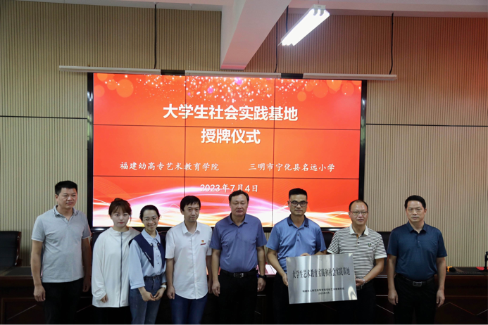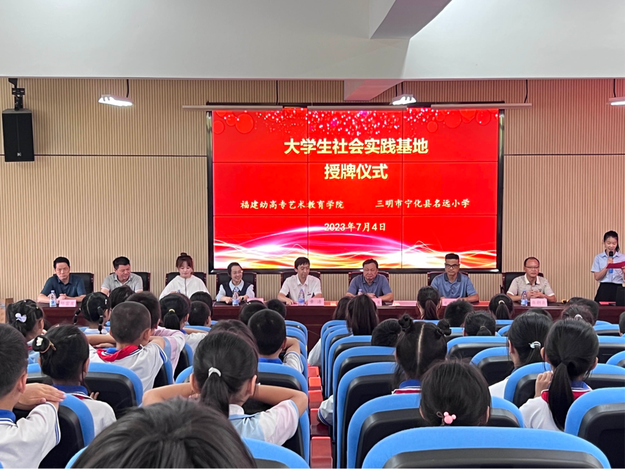 2023年7月4日下午,福建幼兒師范高等專科學校藝術教育學院、三明市寧化縣名遠小學"藝術教育實踐與社會實踐基地"授牌儀式暨"藝海拾貝"社會實踐開班儀式在三明市寧化縣名遠小學報告廳舉行。寧化縣教育局黨組成員、黨委副書記王進良、福建幼兒師范高等??茖W校藝術教育學院學生管理科科長章濤、寧化縣名遠小學校長巫升根、副校長巫朝良、黨支部副書記王盛志、工會主席邱富發(fā)、福建幼兒師范高等??茖W校藝術教育學院團總支書記傅緣陽、實踐隊帶隊教師陳佩伶出席本次授牌儀式暨社會實踐開班儀式。同時參加本次開班儀式的還有寧化縣名遠小學暑期夏令營的學生以及學院"藝海拾貝"社會實踐隊全體成員。