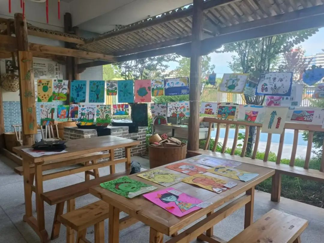 7月10日清晨,美術(shù)手工教學(xué)組的隊(duì)員們已經(jīng)開始進(jìn)行畫展布置。借用名遠(yuǎn)小學(xué)內(nèi)具有客家文化特色的儒學(xué)館作為展示場(chǎng)所,在木制柱子間拉起一道道棉繩,細(xì)心地將一件件手工作品粘在桌面上,作品按美育主題和類別進(jìn)行分區(qū)展示。名遠(yuǎn)小學(xué)的領(lǐng)導(dǎo)老師們也來欣賞孩子們的作品,充分肯定我們幾日的教學(xué)成果,并希望在展覽后將作品保留好。