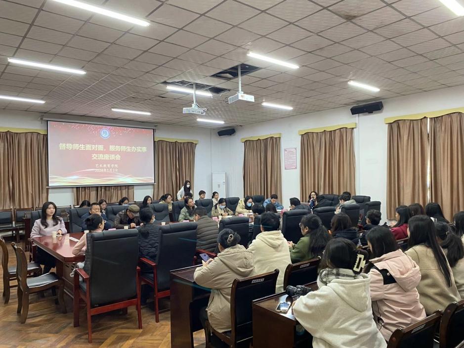 2024年1月3日,藝術(shù)教育學(xué)院在行政樓214會議室開展“師生面對面暨教學(xué)督導(dǎo)座談會”,通過零距離傾聽與交流,及時準(zhǔn)確地了解同學(xué)們對學(xué)院教學(xué)管理的意見和建議。學(xué)院院長王萍萍、黨總支書記姜琪、副院長顏艷、學(xué)生科科長章濤、學(xué)院二級督導(dǎo)、各教研室主任、輔導(dǎo)員以及兩個校區(qū)學(xué)生代表參加了本次會議,會議由章濤科長主持。